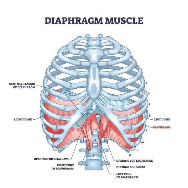 The diaphragm is a dome-shaped muscle at the base of your ribcage. Think of it as the “floor” of your lungs and the “roof” of your core.